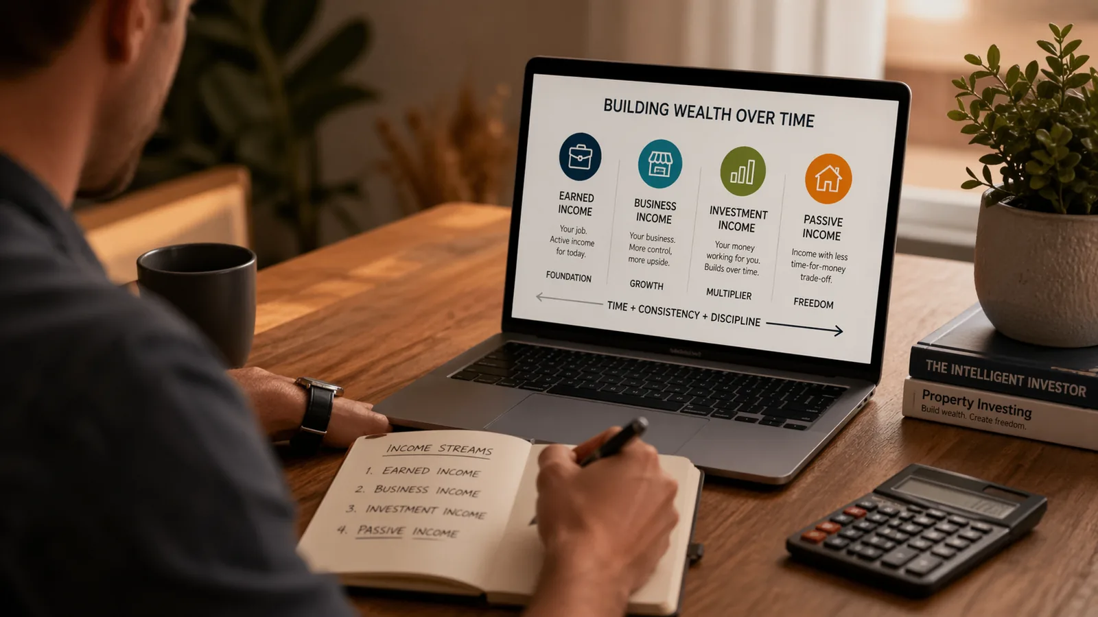 Earned income gives you footing. Business income can lift upside if it suits your temperament. Investment income is where wealth starts becoming more than your labour. Passive income is what turns that long build into freedom.